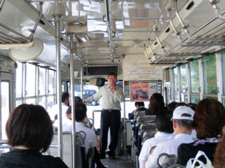 直方市石炭記念館へ向かう車中。 今回の主旨や目指すところなどを熱く語るは、汽車 倶楽部代表・江口。 普段は作業着姿の事が殆どなのですが、流石にそれ は失礼だろうと、Yシャツにスラックスという出で立ち。 |