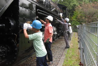 | 夏は雑草との闘い・・・皆さんの「格闘」の結果、機関車の足元はスッキリ! | ||