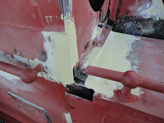 キャブ右前面のようす。 左側もそうでしたが、右側も同様に繋ぎ目部分での腐食がかなり 進行していました。 他にも、傷みが激しく補修しなければならない箇所がまだまだ数多く 残っています。 |
