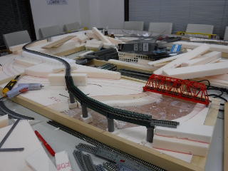 | ただ今、線路形状を検討超、この時間が一番楽しい・・・? 曲線ガーター鉄橋はレイアウト内で大きな見せ場になりそうです。 |