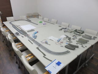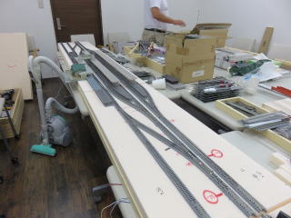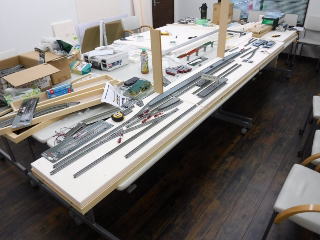 | 組み上がったパネルを並べてみます。思ったより大きい・・・ 早速、駅周りの線路を仮配置してみました。 |