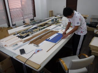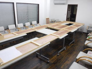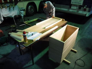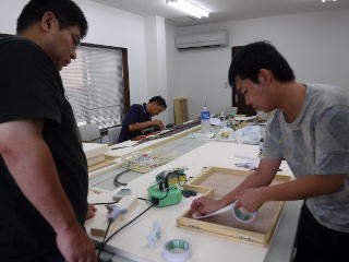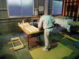 | ベースとなるパネルの組立作業。所定の寸法に切り出した板材を組み上げていきます。 正確さが求められるので、大工さんにお願いしました(ご多忙の中有難うございました)。 |